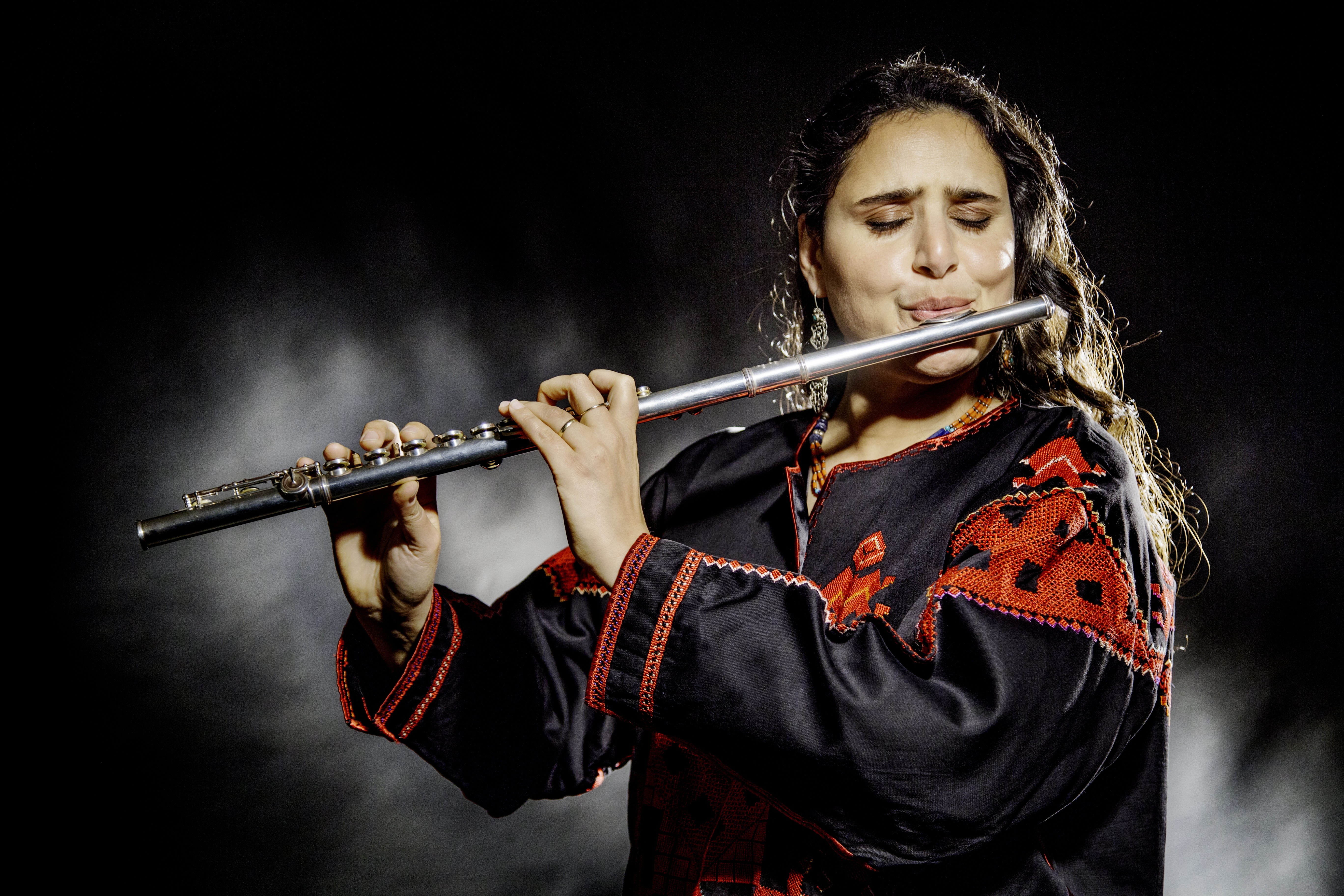 La flûtiste, vocaliste et compositrice Naïssam Jalal (Victoire du Jazz 2019), accompagnée de Mathias Lévy au violon, nous propose une soirée en forme de rituel où se répondent transe et silence. Elle ouvre ainsi un dialogue intime et vibrant, un voyage spirituel avec les comédien.nes, pour que s’étirent les souffles, tous les souffles.