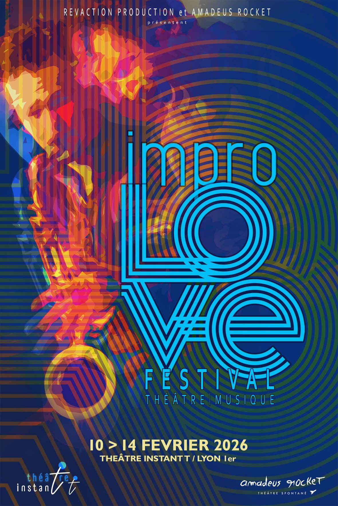 Né en 2017 sous l’impulsion de la compagnie Amadeus Rocket, Impro Love Festival est une déclaration d’amour aux arts improvisés. Théâtre, musique s’y rencontrent, se frottent et s’inventent dans l’instant. Pour cette sixième édition, le festival rassemble des artistes libres, joueurs, portés par le goût du risque et du partage. Impro Love Festival est une célébration vivante et irréversible du spontané : un espace ouvert où les corps, les sons et les imaginaires se répondent, ensemble.